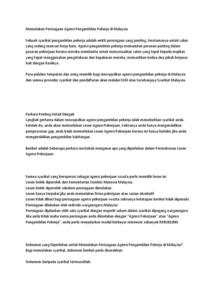 Memulakan Perniagaan Agensi Pengambilan Pekerja Di Malaysia Pdf